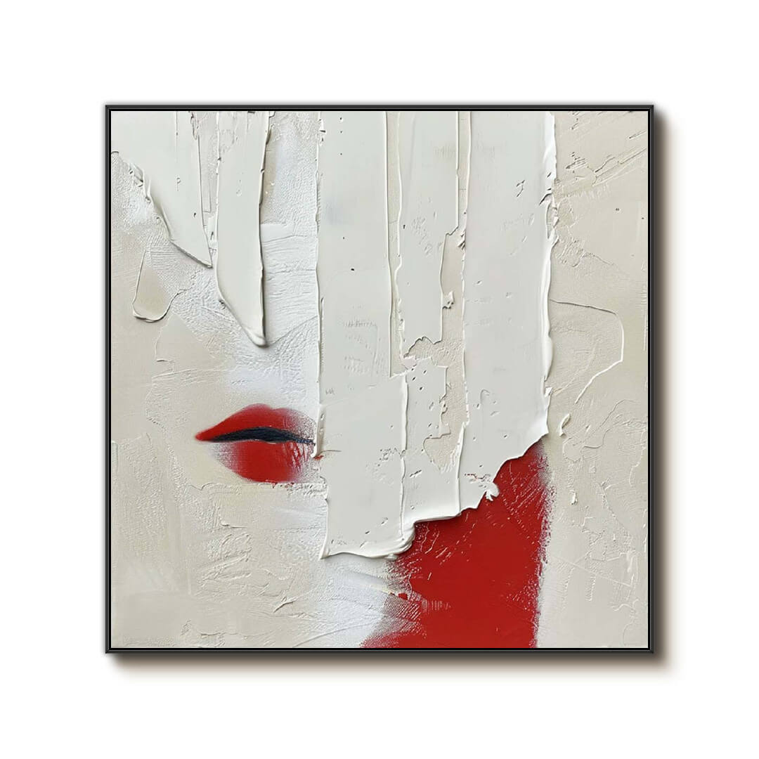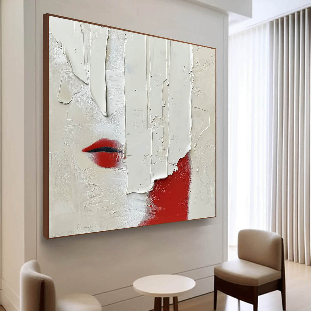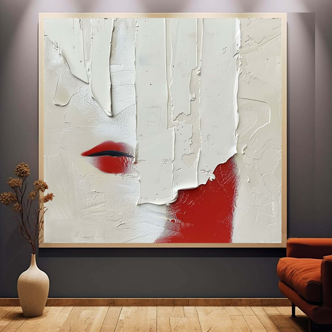 Large Abstract Lips Painting - White and Red Modern Canvas for Bedroom or Hallway Accent Walls - Concealed Kiss - Hues Art Lab