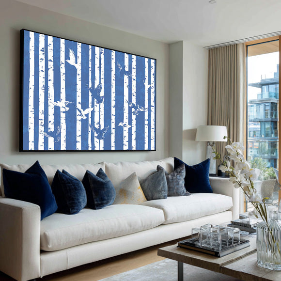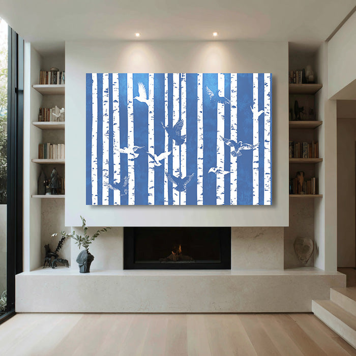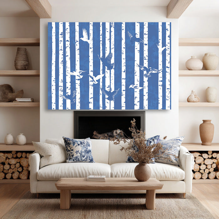 Geometry of the Flight - Blue White Birch And Flying Bird Canvas Art